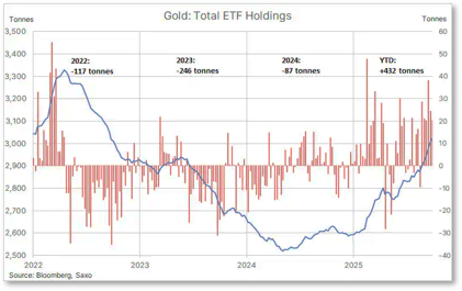 Globally, inflows into gold ETFs have reached $64 billion since the start of the year, according to World Gold Council data, including a record $17.3 billion in September alone. This marks a dramatic reversal from recent trends: over the past four years, gold ETFs saw outflows totalling $23 billion, according to the World Gold Council’s estimates.