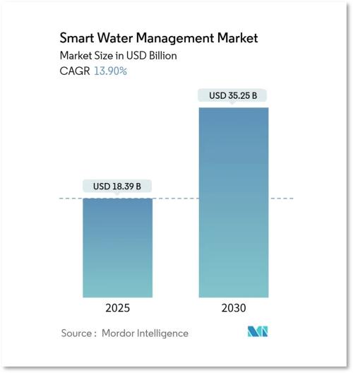 Technology plays a central role in addressing this. The smart metering market (AMI) is expanding rapidly, projected at 16 billion dollars in 2030, with an average annual growth rate of 10 to 12%. Similarly, desalination, concentrated in arid regions such as the Gulf, California and the Mediterranean, is expected to reach nearly 32 billion dollars in 2030, up from 18 billion in 2024.